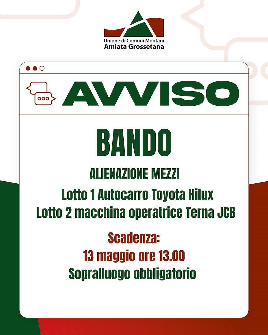 L’Unione dei Comuni Montani Amiata Grossetana informa che è stato pubblicato un bando pubblico per l’alienazione di mezzi di proprietà dell’Ente.