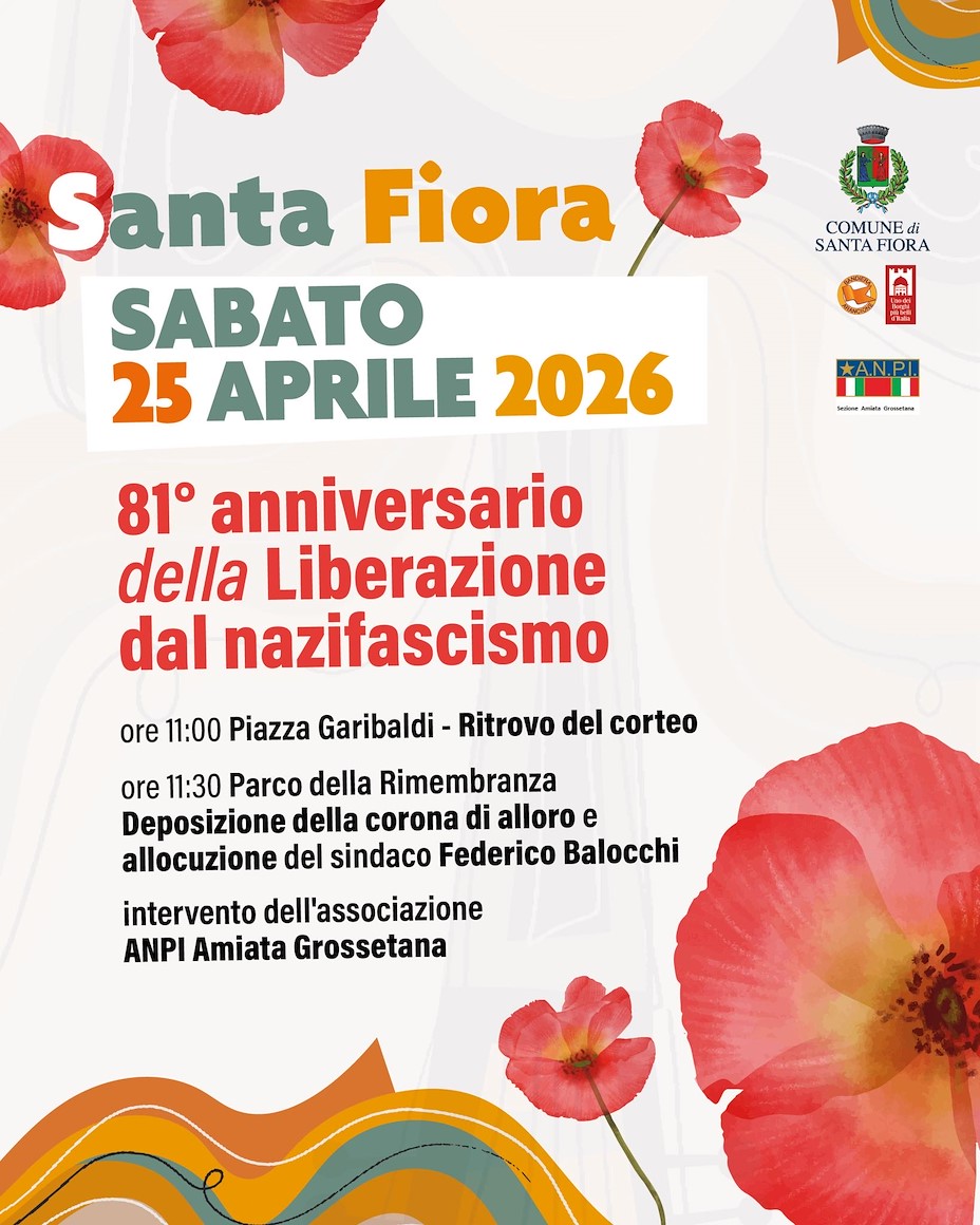 A Santa Fiora il programma delle celebrazioni prevede sabato 25 Aprile, il ritrovo alle ore 11 in piazza Garibaldi per la partenza del corteo, alle 11.30, verso il Parco della Rimembranza dove sarà deposta la corona di alloro. Previsti gli interventi del sindaco Federico Balocchi e di Anpi Amiata Grossetana.